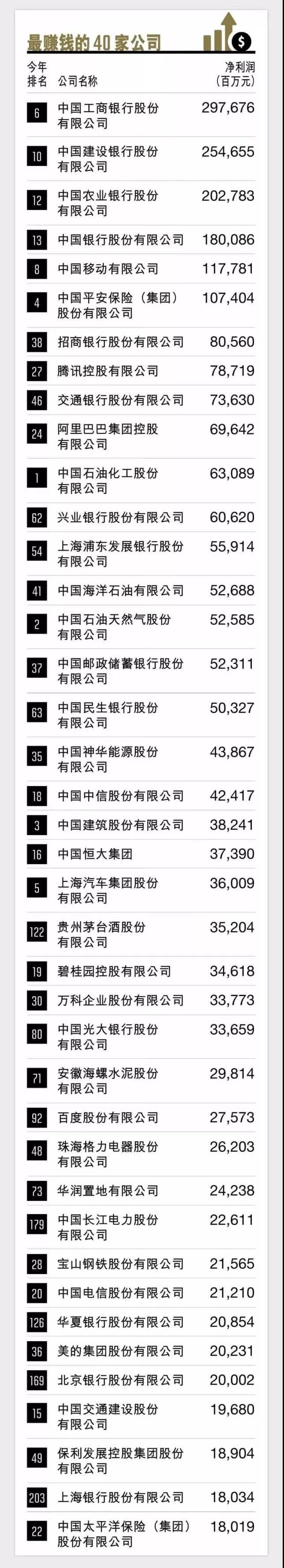中國最賺錢的40家公司,福建僅興業(yè)銀行上榜,排名第12名。在盈利能力方面,與去年情況相同,最賺錢的10家上市公司除了幾大商業(yè)銀行和保險公司之外,仍是中國移動有限公司、騰訊控股有限公司和阿里巴巴集團(tuán)控股有限公司。這十家公司在去年的總利潤達(dá)到1.46萬億,占全部上榜公司利潤總和的40.3%。