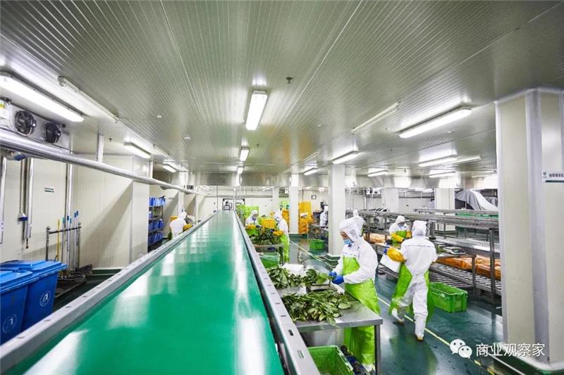 中央工廠都為標(biāo)準(zhǔn)化的工廠,每座工廠都有凈菜車間、肉品分割車間、干貨車間。但也會根據(jù)區(qū)域需求不同,增設(shè)不同功能性車間以更好滿足本地化需求,比如在昆山,彩食鮮的中央工廠設(shè)置了沙拉、三文魚車間。在重慶,設(shè)置調(diào)理品車間做預(yù)制菜。
