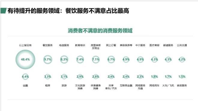 調(diào)查結(jié)果顯示,一半消費(fèi)者不滿(mǎn)意的服務(wù)領(lǐng)域,涉及衣食住行、學(xué)習(xí)工作、社交娛樂(lè)等。其中,主要與“吃”相關(guān)的服務(wù)占16.4%,包括餐飲服務(wù)和網(wǎng)上訂餐。從區(qū)域看,除了餐飲服務(wù)外,蘇南和蘇中地區(qū)對(duì)通信服務(wù)也較不滿(mǎn)意,而蘇北地區(qū)對(duì)教育培訓(xùn)和房屋裝修及物業(yè)較不滿(mǎn)意。
