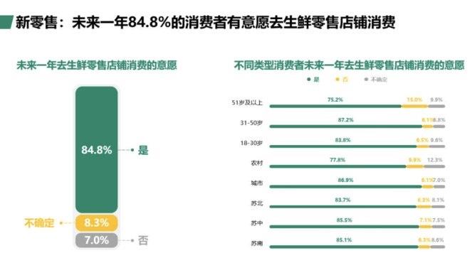 未來(lái),江蘇人對(duì)消費(fèi)有什么新期待?現(xiàn)代快報(bào)記者了解到,在生鮮新零售領(lǐng)域,有將近九成(84.8%)的消費(fèi)者表示,希望到生鮮新零售店鋪消費(fèi)。此外,希望增加生活類(lèi)消費(fèi)場(chǎng)所,包括連鎖/大型超市、百貨/購(gòu)物中心,尤其是蘇中蘇北地區(qū)。