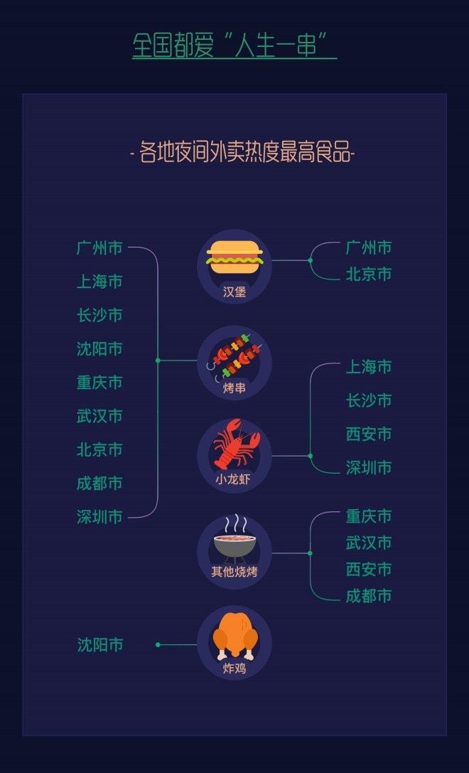 烤串成為多個(gè)城市美團(tuán)用戶最愛(ài)的夜間外賣。面包甜點(diǎn)、小龍蝦、火鍋、奶茶等其他宵夜品類也有明顯增長(zhǎng),折算成等價(jià)食物,約等于北京人民吃掉33萬(wàn)串烤串,武漢人民吃掉22萬(wàn)串烤串,上海人民吃了24萬(wàn)只小龍蝦,逛吃逛吃”成為夜晚首選。北京人民最愛(ài)三里屯,重慶人都去解放碑。