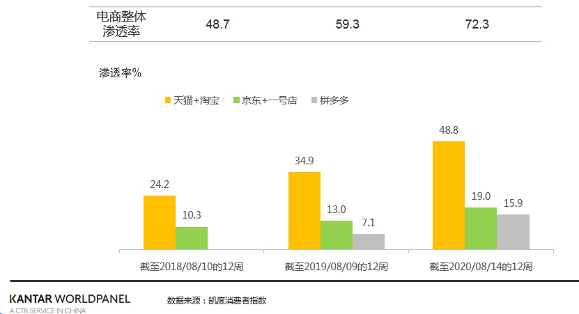 最新報(bào)告也指出,電商繼續(xù)保持43.5%的強(qiáng)勢(shì)增長(zhǎng),因?yàn)樽孕鹿谝咔橐詠?lái),中國(guó)消費(fèi)者已經(jīng)習(xí)慣于網(wǎng)購(gòu)。過(guò)去12周,72.3%的中國(guó)城市家庭在線(xiàn)上購(gòu)買(mǎi)了快速消費(fèi)品,消費(fèi)者規(guī)模顯著增加。阿里巴巴以45.8%的線(xiàn)上市場(chǎng)份額(+1.7)保持領(lǐng)先地位,而京東的市場(chǎng)份額略微下降了0.2個(gè)百分點(diǎn)。