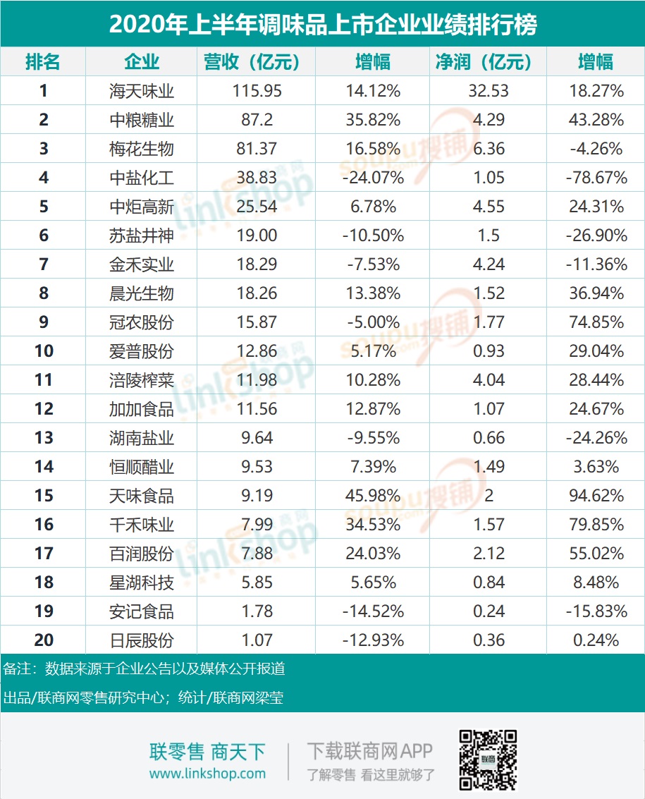 據(jù)聯(lián)商網(wǎng)零售研究中心不完全統(tǒng)計,海天味業(yè)、中糧糖業(yè)、梅花生物、中鹽化工、涪陵榨菜、加加食品、恒順醋業(yè)、天味食品、千禾味業(yè)等20家上市調(diào)味品企業(yè)2020年上半年營收總額約為484億元,平均營收約為24億元。