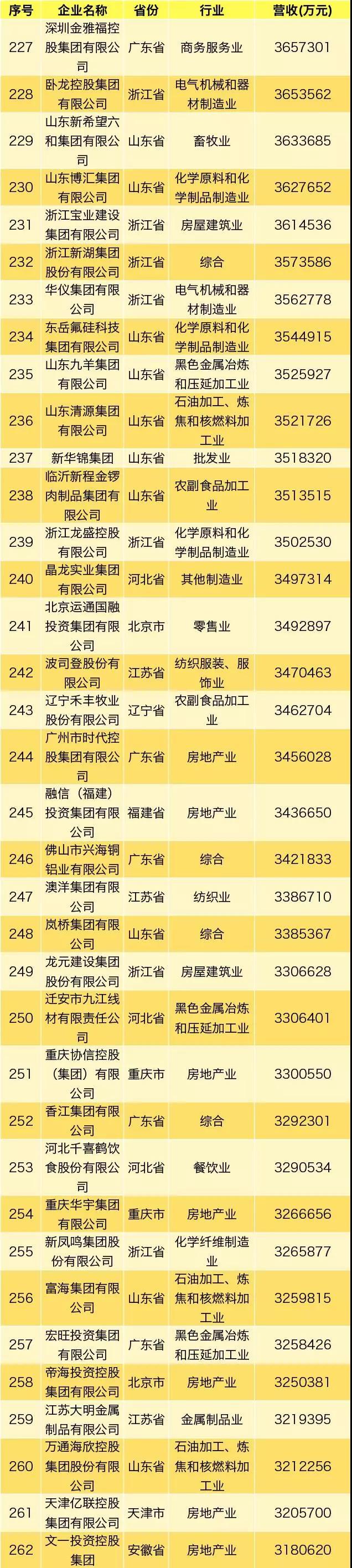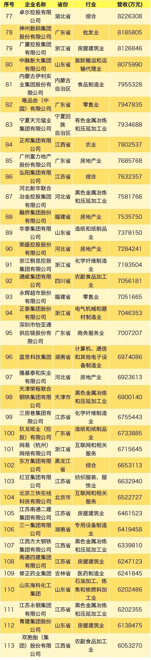 2019中國民營企業(yè)500強榜單中,華為投資控股有限公司以7212億營收排名第一,海航集團(tuán)、蘇寧控股分列二三位,營收額分別為6183億、6025億。正威國際集團(tuán)、恒大集團(tuán)、京東集團(tuán)、碧桂園控股、恒力集團(tuán)、聯(lián)想控股、國美控股進(jìn)入前十,永輝超市位列第93位,本次500強上榜門檻為185.85億。