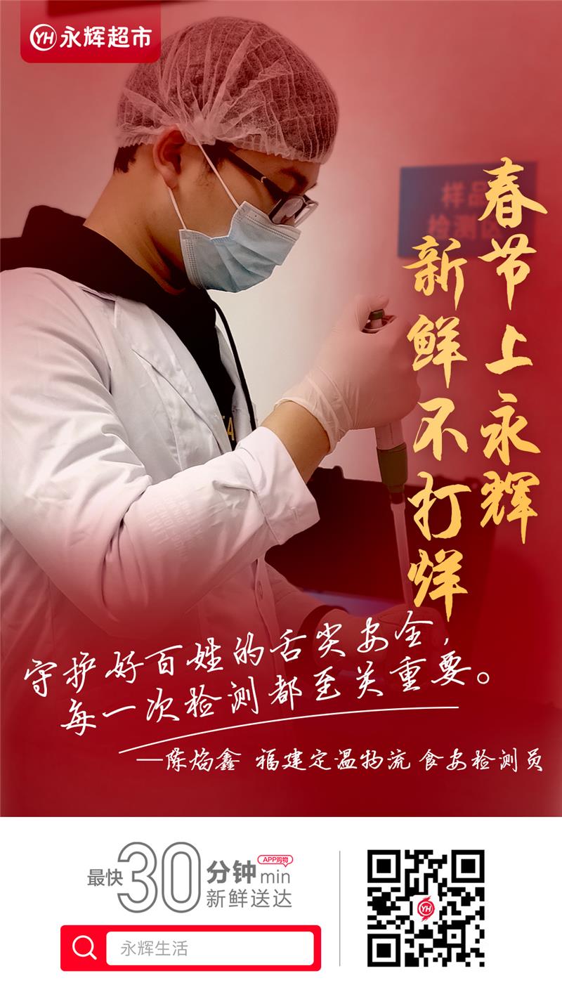 食安檢測(cè)員 陳焰鑫:我的日常工作是在物流端負(fù)責(zé)蔬果檢測(cè),做好儀器設(shè)備的管理,嚴(yán)格遵守檢測(cè)實(shí)驗(yàn)操作規(guī)范,保證檢測(cè)結(jié)果的準(zhǔn)確性,對(duì)檢測(cè)不合格的產(chǎn)品及時(shí)反饋相關(guān)部門,為百姓守好舌尖上的安全。2020年永輝福建定溫物流共完成水果蔬菜合計(jì)257,739項(xiàng)檢測(cè)。