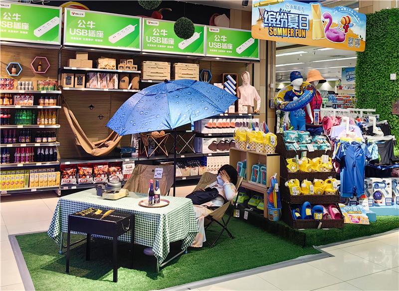 除此之外,永輝也在多家門(mén)店內(nèi)增加了場(chǎng)景式的主題布置,即根據(jù)季節(jié)、節(jié)慶、消費(fèi)場(chǎng)景的不同,在店內(nèi)公共區(qū)域設(shè)置主題并集中展示關(guān)聯(lián)產(chǎn)品。如懸掛了多個(gè)游泳圈的歡樂(lè)水上用品陳列區(qū)、布置了野餐墊和躺椅的戶(hù)外用品陳列區(qū)、集合了牙膏、牙刷、漱口水、牙線棒等關(guān)聯(lián)產(chǎn)品的口腔健康陳列區(qū)等,滿(mǎn)足消費(fèi)者在某一場(chǎng)景下的一站式購(gòu)物需求。
