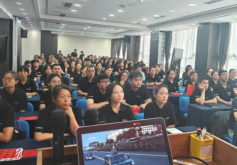 閱兵式開始后,員工們?nèi)褙炞?,感受人民軍隊的威武雄壯、國之重器的磅礴氣勢,現(xiàn)場跟唱國歌,多次響起自發(fā)掌聲和歡呼,民族自豪感與企業(yè)榮譽感在每一位員工心中激蕩。